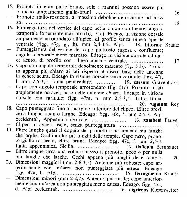 Ancora grazie Jan Honza ha scritto: Questo è Omalium Fantastico, ho sbagliato già dalla s.famiglia Si ripete il maledetto vizio che continuo ad avere, cioè di non riprendere la chiave da capo quando mi accorgo di essere fuori strada: m'intestadisco sul genere senza pensare che l'errore è più indietro Già che ci sono, desidero chiederti se esiste una "buona" (per "buona" intendo a prova di Livio!) chiave delle sottofamiglie. Poi, la caccerei in mano ai due baldi giovanotti Andrea e Federico, dato che di stafilinidi da montare e smistare ce ne sono parecchi. Arrivare almeno alle s.fam farebbe un po' di ordine Ed il mio freezer si svuota, con buona pace famigliare (più di mia moglie che mia). Così posso concentrarmi sui "miei" scarafaggini, bestiole che mi aspettano da troooopo tempo Ora prendo in mano la chiave di Zanetti e cerco di arrivare alla meta. Incominciamo con il rilevare che le impressioni tentoriali, di tipo lineare, escludono un buon numero di specie Ne rimangono solo sei (gruppo O. caesum): vediamo cosa succede! A dopo