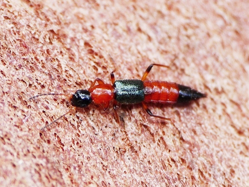 Questo piccolo Staphilinidae stava sotto una corteccia di eucalipto caduta a terra sull'erba. Mi ha colpito perché era di un buon 30% più corto dei Paederus che incontro di solito, e perché aveva la testa più piccola rispetto al corpo e meno rotonda.