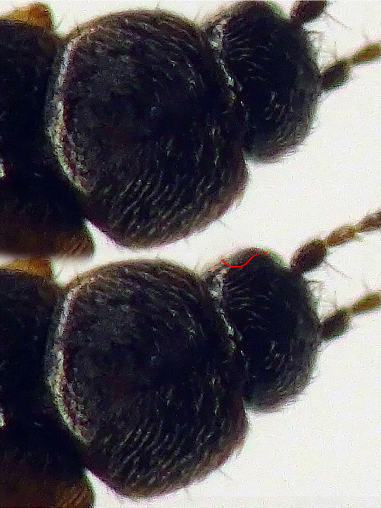 ...per fotografare il soggetto meglio alla luce diurna...l' ho perso con un colpo di vento  ....per fortuna avevo altri esemplari....credo tutti maschi perche' piu' piccoli (1,7 mm.). Mentre scattavo proprio alla luce diurna mi sono accorto del riflesso bluastro a tratti verde bottiglia che sulle foto al led non si nota e che potrebbe essere importante per l' identificazione. Qui sotto il soggetto del probabile maschio con le due esposizioni (notare nella foto al led i peli del pronoto tutti rivolti verso il basso). Adesso vado a vedere se ho delle vecchie foto della testa del soggetto femmina qui sopra, altrimenti ne faccio alcune al maschio.