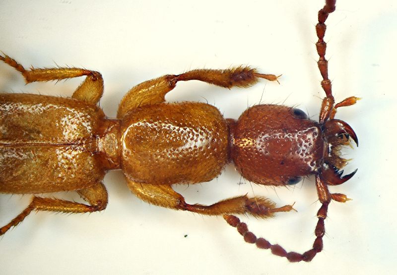 Siamo nella Val Sarentino, 16 km. a nord di Bolzano un valle poco conosciuta (turisticamente) ed ancora vivibile, anche in agosto. Sono a Sarentino il capoluogo della omonima valle, a circa 900/1000 metri . Trovo su un pendio boscoso i resti di quella che era una vecchia catasta di legna...volto qualche rametto e opplà: vedo questo strano Stafilinide che corre a ripararsi. Lo raccolgo e visto il colore da immaturo lo tengo vivo per qualche giorno...ma non c'è verso, rimane così "rosso". Presumo pertanto che sia la sua colorazione naturale.
