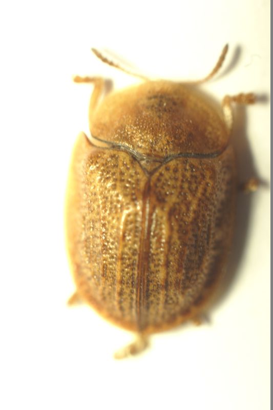 Hypocassida sp. What is colour of abdomen? H. subferruginea has abdomen mostly black, H. cornea from uniformly yellow to brown but never deep black. |