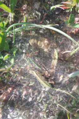 Un amico mi ha mandato queste foto, in pratica ci sono delle tele sparse sul prato a macchie e dentro questo bruco. Il luogo è Abruzzo, bocca di Valle.
