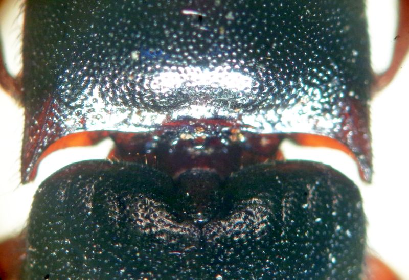 - una falsa carena breve e irregolare tra la carena degli angoli posteriori ed i lati del pronoto (freccia);