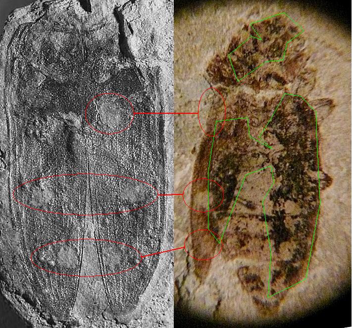 Considera che dell'esemplare di Alexeev è rimasto solo parte del torace e le elitre, e lo stiamo vedendo dal lato ventrale, inoltre è molto più schiacciato (dal disegno si capisce meglio). Mentre questo cinese è quasi intatto. Le costolature delle elitre si vedono appena anche in quest'ultimo, ma è normale che possano essere più o meno sviluppate sulla superficie superiore e su quella inferiore.