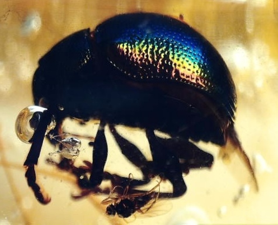 Molto interessante la conservazione della colorazione metallica sulle elitre del coleottero che sfuma in vari colori.