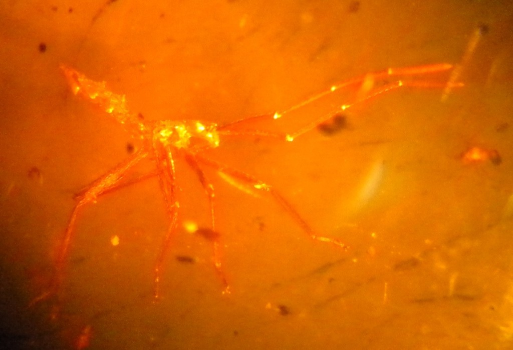 Come dicevo, eccomi qui a postare qualcuno dei miei pezzetti. Comincio con questo: Inclusione in ambra dominicana, oligocene-miocene, diciamo sui 20-25 milioni di anni. Sarà lungo sugli 8mm dalla punta delle antenne a quella dell'addome. riuscite ad identificarlo? Purtroppo le foto sono quello che sono.Dall'osservazione al microscopio posso dirvi che ha 6 zampe con doppio uncino alla fine, due occhi compositi,niente ali, due antenne spesse e lunghe come l'insetto stesso,una lunga proboscide rivolta all'indietro. L'addome sembra incompleto,non in lunghezza,ma sembra manchi la "parte di sotto".però sotto questa prospettiva il campione è di difficile osservazione. Concludo scusandomi per la terminologia poco scientifica, ma con gli insetti sono agli inizi. grazie e ciao!