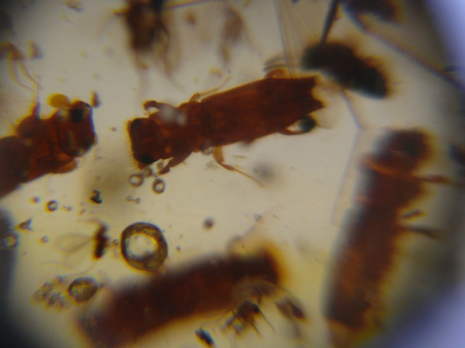 Ho in collezione questo campione di copale e al suo interno ho trovato questa meravigliosa moriade di coleottero (Curculionidae: Scolytinae)(0,4 cm l'uno) più di 80-100 esemplari inclusi nel copale. In collezione ho tre campioni con questo tipo di moriade sempre dello stesso tipo di coleottero, trovati anni fa in un lotto di copale grezzo, poi lucidati da me. Il coleottero in se è comune nel copale, in singoli esemplari, ma l'associazione in moriade è molto rara. Il copale è stato trovato a Sambava nel Madagascar. Pleistocene 100.000 anni circa. Chiedo una mano per avere una classificazione più precisa. Grazie mille.