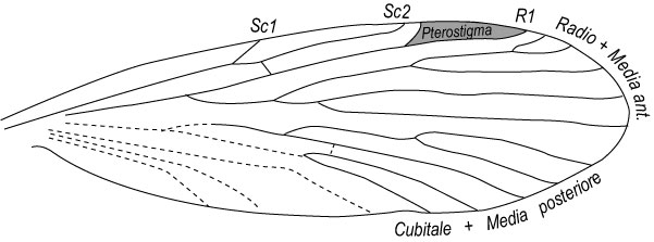 Ad ogni modo mi sono permesso di ricostruire lo schema delle nervature alari (sommando entrambe le impronte delle ali), così da avere una visione più chiara. Si distinguono bene i settori principali (Radio + Media anteriore, Cubitale + Media posteriore, e presunte nervature anali), e lo pterostigma. Tutti elementi tipici di questo raggruppamento.