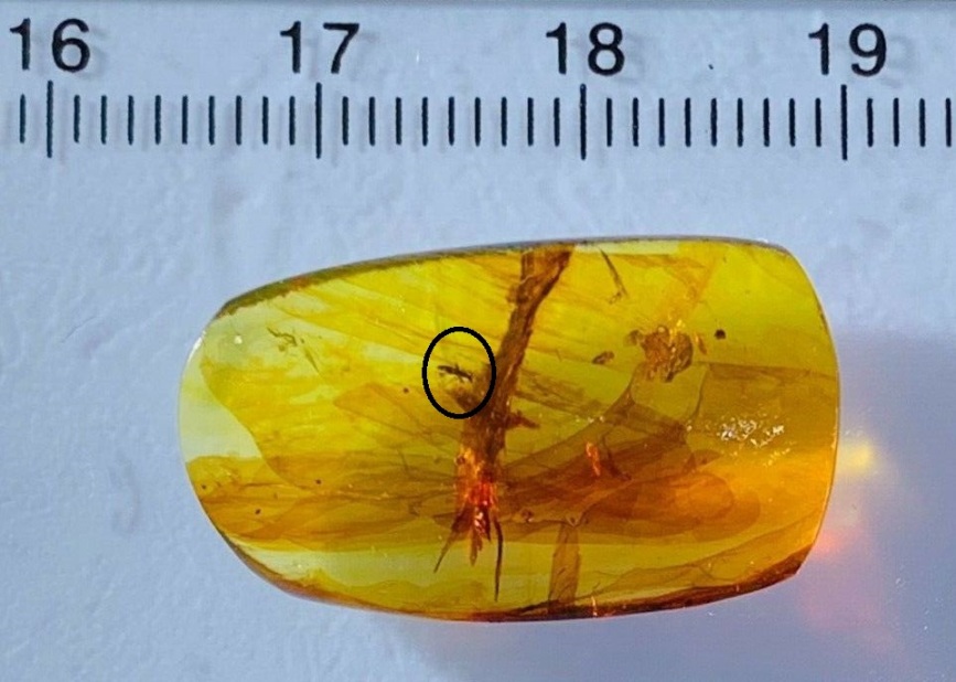 Alessio, allego la foto del campione d'ambra intero con cerchiato il piccolo coleottero.