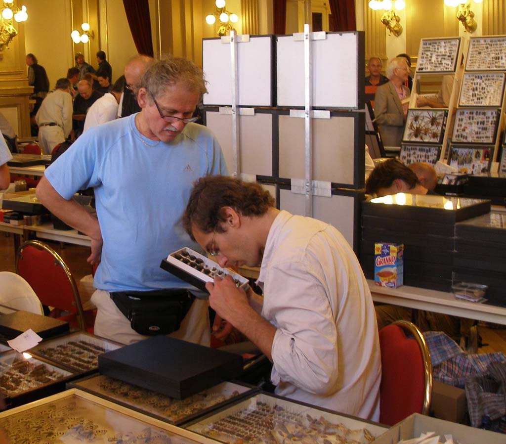 Manfred Egger (Austria) e Pierpaolo Rapuzzi (Xylosteus) alle prese con un espositore tailandese (aveva, fra l'altro, Lucanidi a buon mercato)