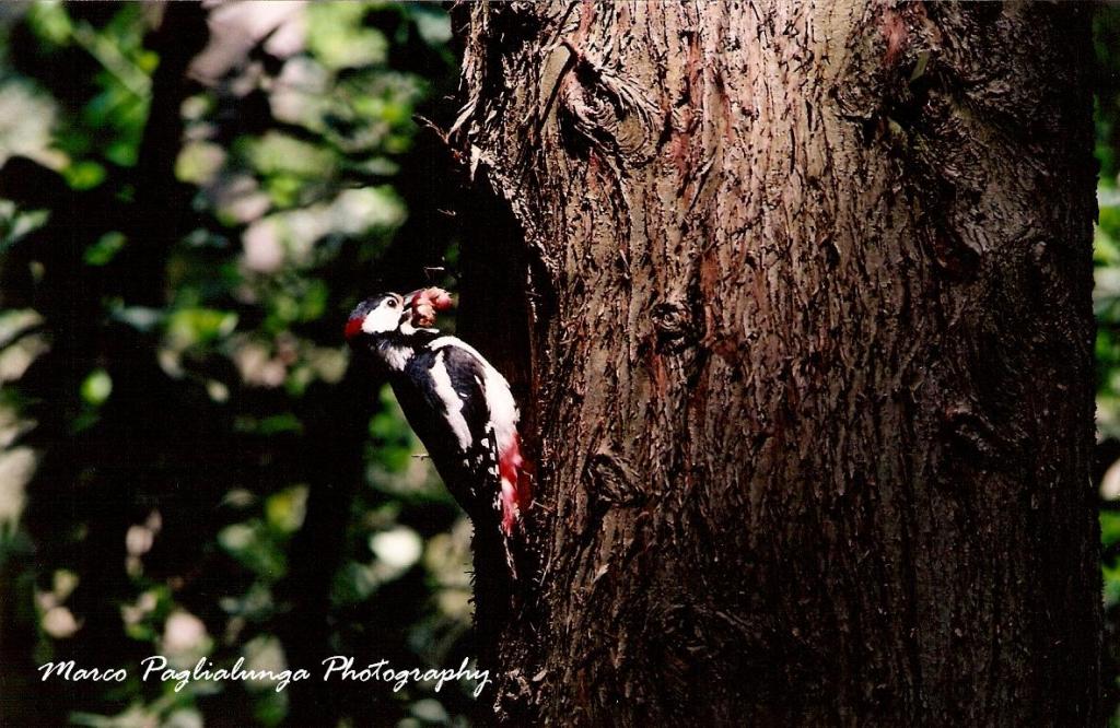 Circa 10 min e niente,inizio a pensare che sia troppo sospettoso,io sono praticamente in un silenzio tombale e fermo come una roccia.All'improvviso sento e intravedo,da sotto il telo(l'unico buco è quello per il teleobbiettivo della macchina fotografica)uno sfarfallio di ali.E' lui!!Un maschio di Picchio rosso maggiore (Dendrocopos major) con una macchia rosso fuoco nella nuca.Bellissimo.Si è agganciato al cipresso dal lato opposto e adesso stà girando davanti a me,a portata del mio campo visivo,sotto il buco del nido.I piccoli l'hanno già sentito e sono in fermento,ma lui aspetta guarda in alto,in basso,a destra,a sinistra,solo quando si sente sicuro,inizia a imbeccare.Due,tre,quattro volte dentro e fuori...ma quante bocche ci saranno lì dentro?(da 4 a 7 uova ho letto).Dopodichè entra e dopo qualche secondo si affaccia con nel becco gli escrementi dei suoi cari pullus e parte come un fulmine.