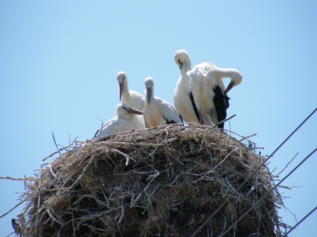 Da notare i numerosissimi passeri che approfittano nidificando nel nido delle cicogne