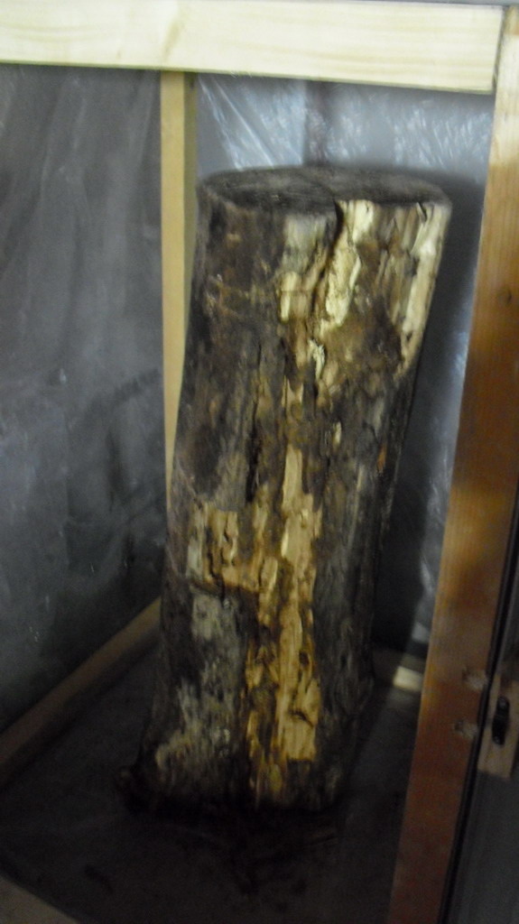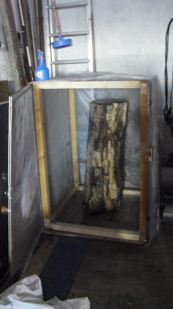 Ritornando al discorso larva, ho praticato un foro nel tronco, ci ho messo la larva, chiuso con rosura e ho messo il tronco (inumidito con nebulizzatore) in verticale nella voliera, messo nel senso naturale. La voliera l'ho messa nel garage (più umido e fresco della temperatura ambientale) e coperta ai lati, dietro e sopra con un sottile telo di plastica:
