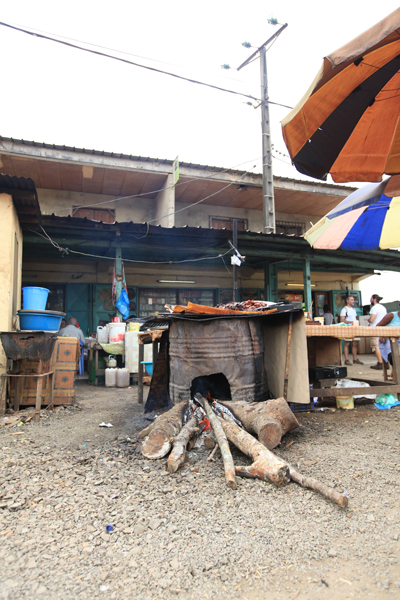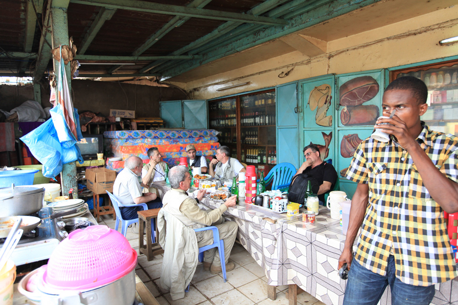 Verso le 13:30 arriviamo in un villaggio maggiore, dove ci fermiamo. Antonio e Pietro ci dicono che mangeremo presso un ristorante tipico del posto. Osservo gli sguardi degli altri, e ho la netta impressione che nessuno ne sia molto felice. Non perché manchi la fame ma probabilmente perché le bancarelle disposte lungo la strada con il cibo cotto e crudo o affumicato in bella vista sotto il sole cocente e esposto a ogni e di più, non è proprio come siamo abituati nel nostro mondo sterile e civilizzato dove la commessa si mette il guantino in lattice per prelevare il panino confezionato dal banco frigo e lo serve con posate monouso rigorosamente confezionate. No, qui è leggermente diverso. la cacciagione, frutto di una notte di lavoro è stata venduta dal cacciatore in mattinata direttamente al ristoratore. Questo la taglia in porzioni e la espone in bella vista in cima ad un grande fusto di petrolio vuoto, e un pezzo di cartone ondulato, recuperato da qualche scatolone gli fa da piatto. In men che si dica la carne è ricoperta da una fitta coltre di mosche verdi e nere, ma questo non infastidisce. Nessuno vuole fare il pignolo, e in attesa che si cuocia la carne brindiamo con una fresca birra d’importazione. Sembra assurdo, ma gli unici frigoriferi che si vedono sono quelli pubblicitari stipati di birra e coca cola. Tutto il resto viene conservato all’aria aperta.
