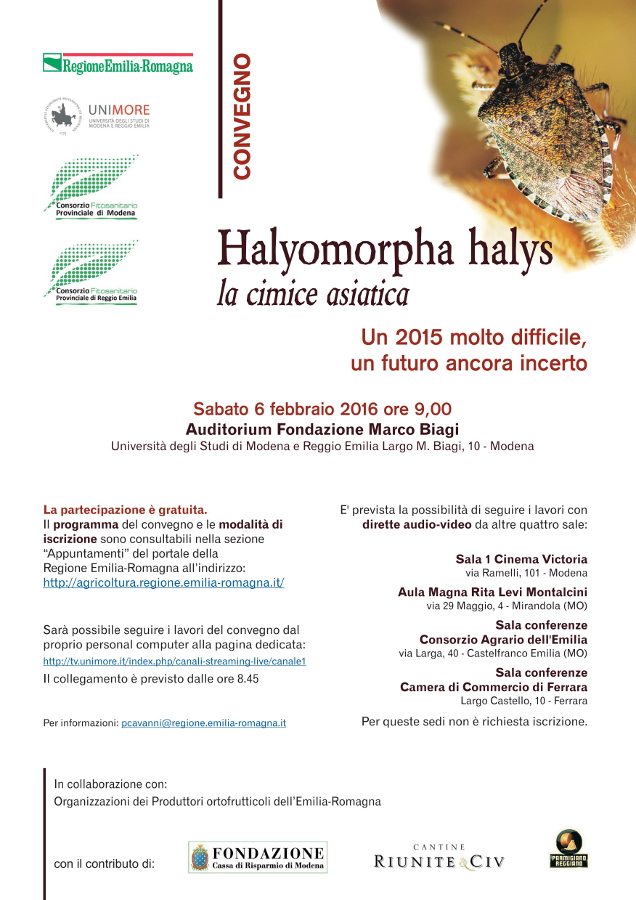 - Il workshop scientifico "Recent trends in H. halys research", che si terrà venerdì 5 febbraio 2016 a Reggio Emilia dalle 14.00 presso la sede del Tecnopolo (situato dietro alla stazione centrale di Reggio Emilia) e prevede anche la partecipazione di Anne Nielsen (Rutgers University, NJ, USA) e Tim Haye (CABI, Svizzera), intende essere un primo momento di confronto sulle più recenti ricerche relative a questo insetto. Chi fosse interessato a partecipare è invitato ad inviare un email a: