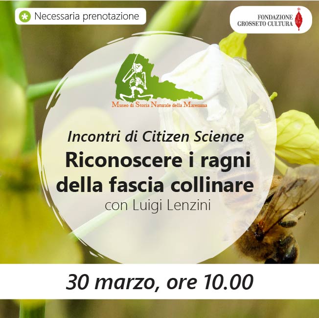 Cari amici, il prossimo 30 marzo ci sarà un incontro a carattere divulgativo presso il Museo di Storia Naturale di Grosseto, organizzato da Andrea Sforzi, in cui farò una chiacchierata generale sui ragni, e illustrerò le caratteristiche di alcune specie significative. Nel pomeriggio faremo una breve escursione in campagna (in stile Bioblitz) per incontrare e riconoscere i ragni in natura.