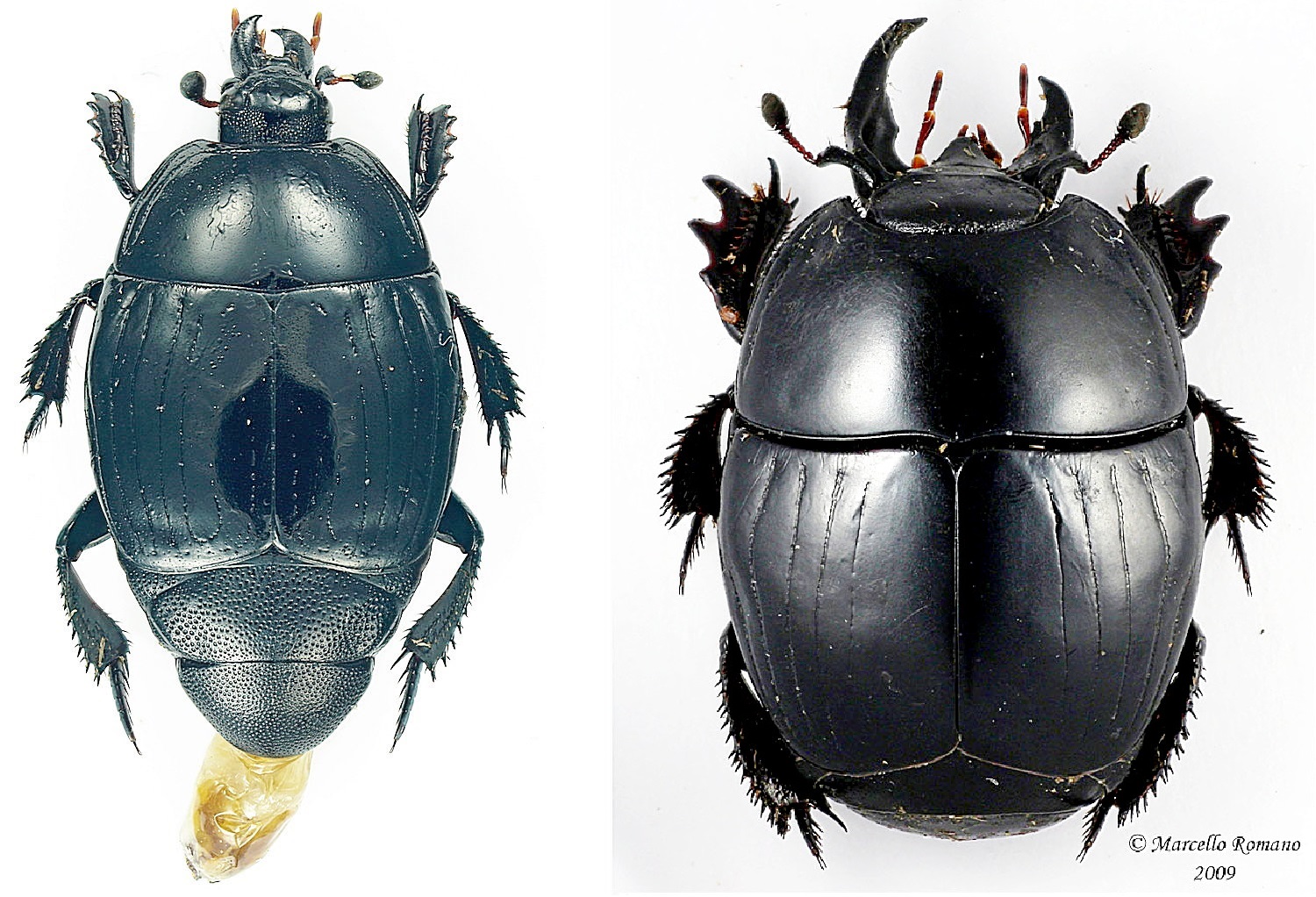 Esemplare di circa 9 mm. raccolto nello sterco bovino in una foresta d’alto fusto di Quercus caducifolie. Le strie laterali sul pronoto sono due, tracciate nettamente e ben visibili, passanti detro la base del capo. Inoltre lungo il bordo del pronoto è possibile identificare non senza difficoltà una esilissima marginale che lo percorre per quasi tutta la sua lunghezza. La superficie del pronoto appare liscia ed esente da punteggiatura visibile (appena percettibile qualche punto finissimo) e da qualsiasi altro rilievo Sulle elitre la prima stria a partire dal bordo laterale è lunga poco meno dell’elitra, è curva decorrendo parallelamente al margine ed è appena visibile dall’alto, così da poter essere assimilata alla sub-omerale. Le quattro strie sucessive sono paralele al bordo, lievemente curve, lunghe quasi quanto l’intera elitra. Procedendo verso la sutura elitrale si incontrano altre due strie, lunghe rispettivamente circa un terzo e circa un quarto delle altre quattro, l’ultima raccordata con una successione di punti grossolani allineati che orla l’estremità distale dell’elitra stessa. La punteggiatura è assente dalla superficie delle elitre. Il capo si presenta suddiviso in due regioni da un margine rilevato curvo che separa la parte anteriore (apicale), subtriangolare e bordata lungo il margine anteriore, da quella posteriore (basale) subrettangolare; la superficie è segnata da una punteggiatura più grossolana posteriormente, lungo la base del collo, più fine anteriormente e sulle mandibole. Una punteggiatura abbastanza grossolane è impressa su propigidio e (in minore misura) sul pigidio, e così pure sul lato ventrale, dove essa però si addensa lungo i lati, restando assente su tutta la fascia centrale. Sono punteggiati sul lato superiore i femori anteriori. Grazie ! Paolo |