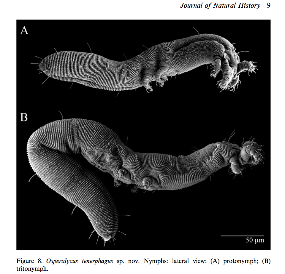 Segnalo qui questa pubblicazione internazionale, i cui articoli non sono di norma scaricabili liberamente, per la presenza, nell'ultimo fascicolo, pubblicato on-line il 20 febbraio scorso, di un lavoro open-access, che descrive e figura, attraverso straordinarie foto al microscopio elettronico a scansione, un nuovo genere ed una nuova specie di Acaro.