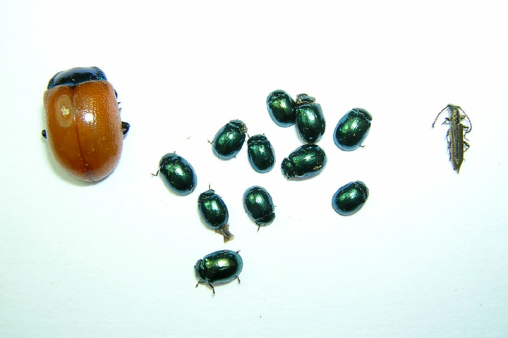 Ieri pomeriggio, vista la bella giornata, ho deciso di farmi un bel giretto in un luogo che ho scoperto da poco, il quale mi ha regalato già a suo tempo una bella coppia di Amphimallon assimile (il maschio catturato al volo, la femmina allevata e cresciuta in cattività). La mia intenzione era quella di ombrellare i vari alberi e arbusti sparsi lungo la stradina (pioppi, salici, querce, olmi, biancospini, ecc..), ed annotarmi per ciascun albero le specie che cadevano nell'ombrello, e così ho fatto. In seguito però mi sono reso conto che molte specie (i Chrysomelidi qui sotto ad esempio) erano praticamente su ogni pianta e ho finito per abbandonare questa idea... oltre alle speranze di trovare qualcosa di buono per me :oooner: