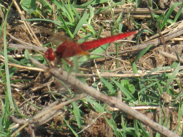 Non avendo la possibilità di mettere trappole  , nè tantomeno di effettuare una caccia al lume  , mi sono dedicato alla caccia nello sterco, tecnica che ultimamente mi ha regalato ( e continua a fruttarmi  ) molte specie interessanti  , almeno dal mio punto di vista  . Dirigendoci verso i pascoli di bovini, io e mio padre ci fermiamo in un abbeveratoio per fare scorta di tanta acqua fresca.  Io cerco escrementi, ma sono tutti secchi. La calura dei mesi estivi, soprattutto nel mese di agosto, qui si sente molto perchè non siamo in quota. Penso che per ottenere qualche cosa in più (coprofagicamente parlando  ) il periodo ottimale, almeno in questa località, sia la tarda primavera e inizio estate, quando la temperatura non è troppo elevata e le "fatte" non si seccano subito. All' improvviso un bagliore rosso che sfreccia nell' aria ci sorprende: una libellula, suppongo la comune Crocothemis erythraea, fa il giro di ricognizione del suo feudo, si posa su uno stelo d' erba e mi da la possibilità di ottenere qualche (pessimo  ) scatto.