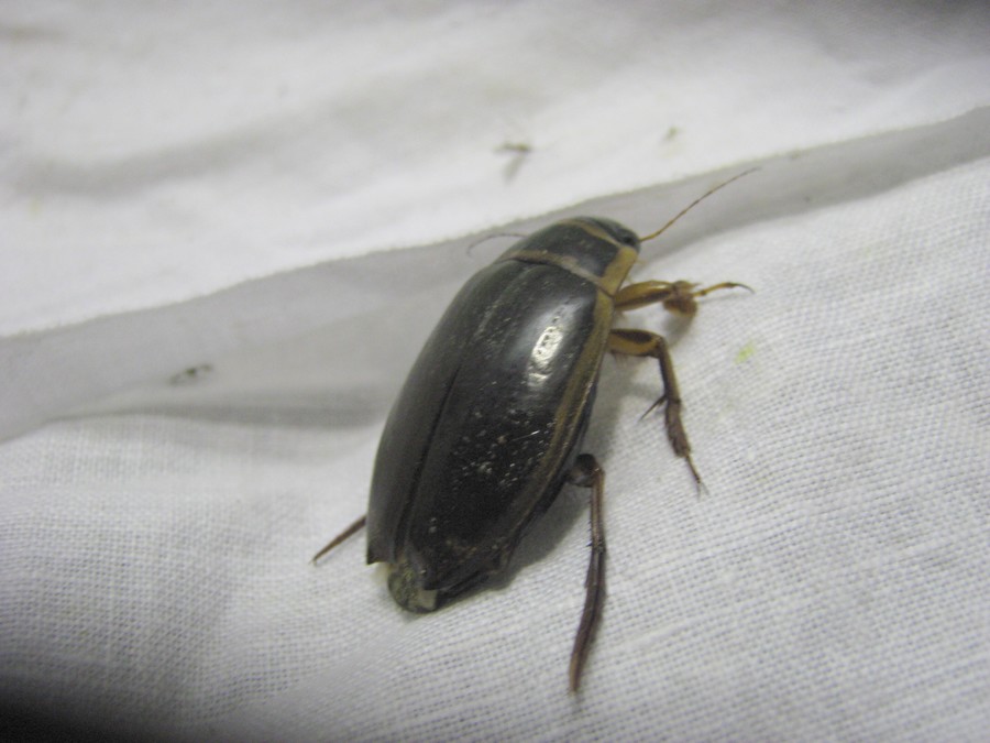 In un tronco di ontano marcio al punto giusto troviamo dei Dorcus musimon Gené, 1836, adulti e larve, poi delle Uloma rufa (Piller & Mitterpacher, 1783) e Uloma culinaris (Linnaeus, 1758), alcuni Ampedus, dei Lacon punctatus (Herbst, 1779), e uno Scydmaeninae per Honza. Facendo cadere al suolo un ramo morto attaccato ormai dalle termiti da un vecchio leccio troviamo alcuni Probaticus ebeninus ebeninus (Villa, 1838). In breve tempo arriva il tramonto e torniamo all’auto a prepararci per la caccia al lume. Alle 20.30 accendiamo, rapidamente la temperatura cala, e ci ritroviamo dalle maniche corte alle felpe in pail e giubbotto. Iniziano ad arrivare le farfalle (che mostrerò in seguito) e qualcun altro ci visita al telo. Un Hydrous pistaceus Laporte de Castelnau, 1840 uno stafilinide Deleaster dichrous (Gravenhorst, 1802) det. Honza ( )un Dytiscus pisanus Laporte de Castelnau, 1835 |
