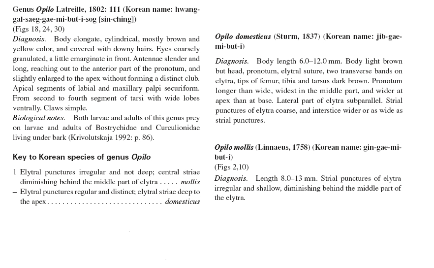 Grazie Marcello, avevo visto il lavoro coreano. Ed anche questo dove alla figura 4 è ben illustrata la differenza tra O. mollis e O. domesticus. In più nel sito dell'editore Apollo Books c'è la pagina illustrativa del libro Checkered Beetles. Illustrated Key to the Cleridae of the Western Palaearctic. di R. Gerstmeier, e guarda caso, anche se leggibile con qualche difficoltà, è riprodotta proprio la pagina degli Opilo. Con le chiavi si arriva a Opilo mollis per i nostri esemplari barbaricini (anche per la forma delle elitre a goccia, mentre O. domesticus ha margini suparalleli). Il problema è che tutti i nostri esemplari sono molto più chiari di quelli visibili in rete, con colori meno contrastati, e con una punteggiatura elitrale visibilmente differente. In più la macchia distale delle elitre è negli esemplari barbaricini subapicale, in quelli fotografati in rete sempre apicale e più grande. Insomma io un'occhiata intendo proprio dargliela. Qualcuno ha esemplari delle due specie? Roberto