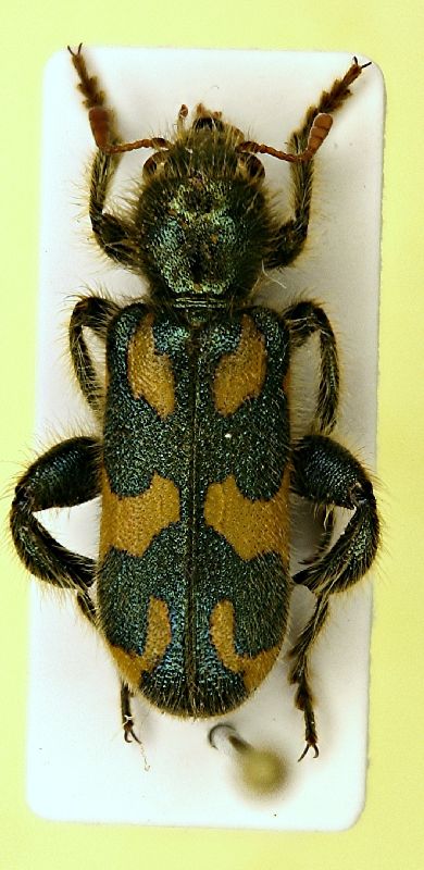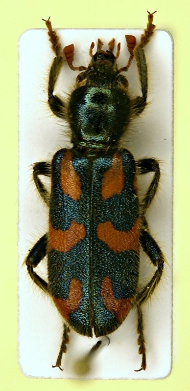 Il Trichodes ammios (Fabricius, 1787) è una bella specie, di dimensioni intorno ai 15 mm., caratterizzata dalla presenza, nel maschio, di una lunga lamella arcuata all'apice dei femori posteriori. Nella checklist della fauna d'Italia è segnalata di Sardegna e Sicilia ed è presente anche in Nord Africa. Normalmente le elitre sono nero-bleu con fasce e macchie rossastre (vedi qui). Più di rado si incontrano individui con le elitre verdi e fasce e macchie giallastre, come questo maschio raccolto a San Vito Lo Capo, il 6 giugno scorso.