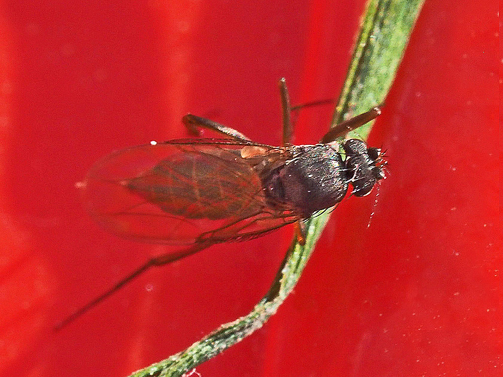Con il proposito di ricostruire lo sviluppo di Crioceris_quatuordecimpunctata, di cui ho fotografato la larva, l’ottobre dell’anno scorso ho raccolto numerosi frutti di Asparagus officinalis L. In questi giorni, nella scatola (chiusa) in cui li ho riposti, ho trovato un piccolo dittero che si muoveva fra le bacche. E’ ipotizzabile che sia quindi un dittero dei frutti. Le fotografie non sono dettagliate: dopo un breve intontimento, l’insetto è scappato, però mi sembra interessante. Ho fatto una breve ricerca fra gli Agromyzidae, ma senza convinzione (le nervature delle ali non sono appropriate). Sono poi approdata alla famiglia Phoridae proprio per la singolarità delle nervature e i femori che mi sembrano abbastanza robusti. Alcune specie del genere Megaselia si avvicinano molto al mio insetto. Che ne dite?