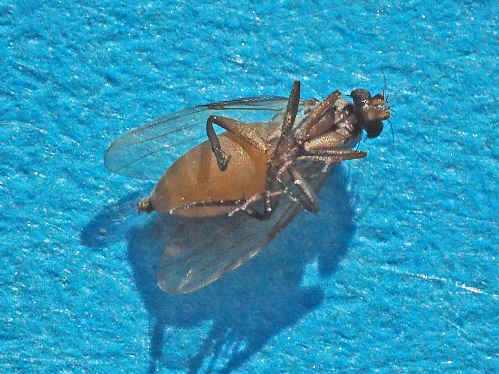 Si, è certamente un Phoridae, ma non è facile andare oltre. Io non sono ancora riuscito a trovare il genere di quelli che frequentano i vetri delle mie finestre, non riesco a seguire le chiavi. In termini puramente statistici potrebbe anche essere una Megaselia: pare che oltre il 60% delle specie descritte di Phoridae appartengano a questo genere.