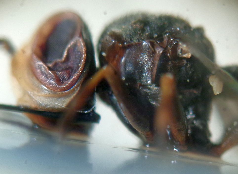 Grazie ancora Carlo, ma concedimi un ultimo appello a maggior ingrandimento; tutta l'ala è cosparsa di brevi peli eretti un po' arcuati all'apice (microscopio ottico, 250 x, ma non ho apparato fotografico adeguato); nella foto a 80 x (con ingrandimento in fase di croppaggio) sono come sotto li vedi; peli sono presenti anche ai margini anteriori e posteriori delle ali. In alternativa, se mi dici quale chiave usi vedo di indagare io stesso.