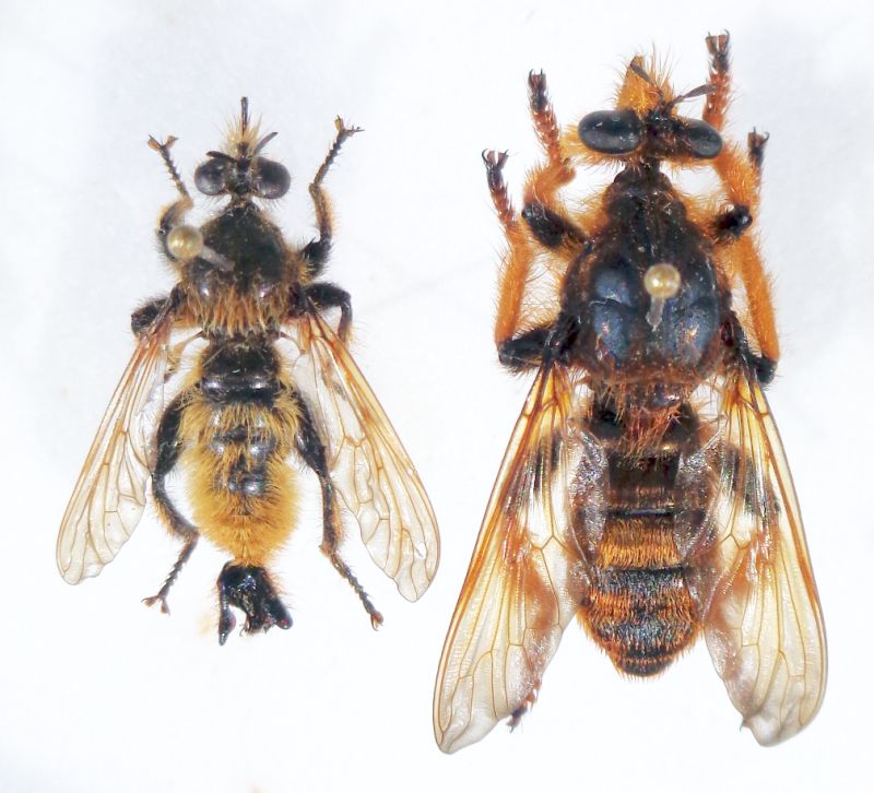 In quest'ultima foto l'insetto a destra è un Pogonosoma maroccanum (Fabricius, 1794). Dalle chiavi del Seguy direi che il primo soggetto è Laphria flava (Linnaeus, 1761); dammi però ancora un po' di tempo per altri controlli.