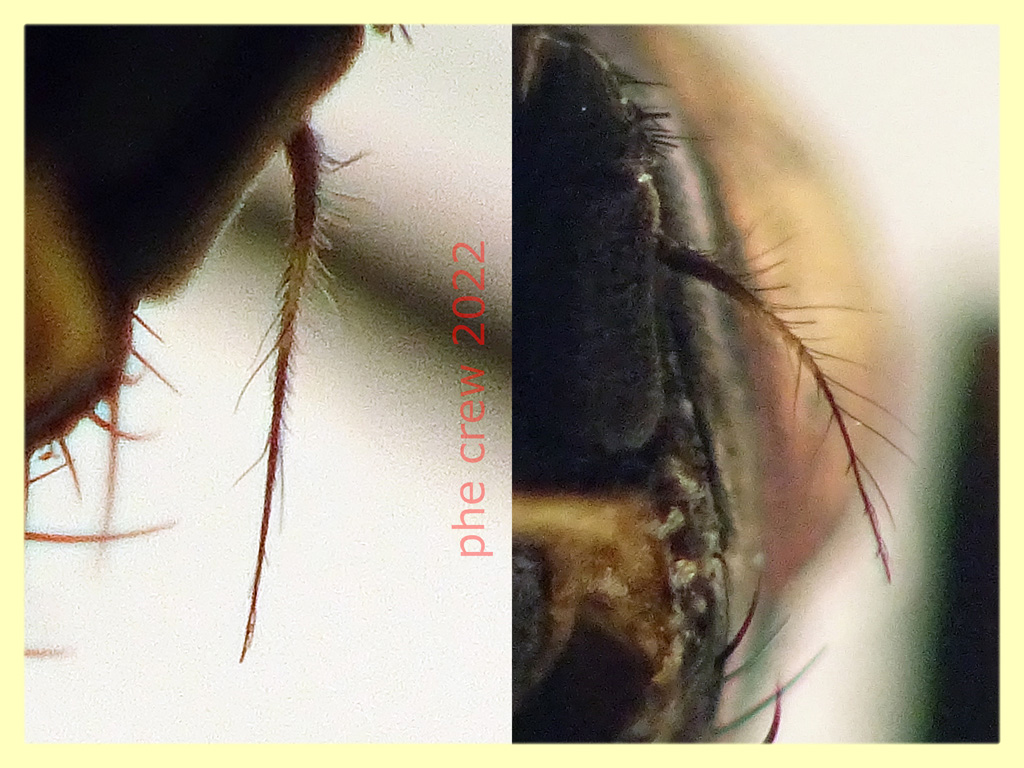 ...sto seguendo le chiavi Mikes insect keys sezione Muscidae: https://sites.google.com/view/mikes-ins ... h-muscidae ….quando pero' arrivo alla pg. 4 dal disegno della coxa non riesco a capire,...quando dice "margine posteriore interno della coxa della zampa posteriore peloso" nel disegno dovrebbero essere i peli segnati in rosso...giusto ?....e qua ci siamo...la coxa mi risulta nuda, pero' nell' altro punto che dice "margine posteriore interno della coxa della zampa posteriore senza peli…….Se ci sono una o due setole sulla punta del margine posteriore interno, controlla di nuovo le vene anali, alcuni Fannidae hanno queste setole" ….dove sono disegnate queste setole ? ...ho fatto le foto alla coxa, i peli non ci sono….ma le setole (anche se per me l' habitus e' di una Hydrotaea sp. e non di un Fannidae) per esserne sicuro non riesco proprio a capire dove sono posizionate ! ….nel frattempo ho trovato un bel lavoro sulla venulazione Muscidae e Fannidae che pero' e' troppo pesante per il forum che si chiama: "Costal vein chaetotaxy, a neglected character source in Fanniidae and Muscidae (Diptera Calyptratae) Verner Michelsen 2022" da dove poi ho preso spunto per i dettagli qua sotto….a me sembra proprio una Hydrotaea sp....ma ovviamente potrei sbagliarmi... |
