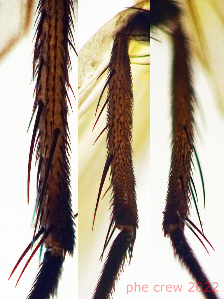 ….quando pero' arrivo alla pg. 4 dal disegno della coxa non riesco a capire,...quando dice "margine posteriore interno della coxa della zampa posteriore peloso" nel disegno dovrebbero essere i peli segnati in rosso...giusto ?....e qua ci siamo...la coxa mi risulta nuda, pero' nell' altro punto che dice "margine posteriore interno della coxa della zampa posteriore senza peli…….Se ci sono una o due setole sulla punta del margine posteriore interno, controlla di nuovo le vene anali, alcuni Fannidae hanno queste setole" ….dove sono disegnate queste setole ? ...ho fatto le foto alla coxa, i peli non ci sono….ma le setole (anche se per me l' habitus e' di una Hydrotaea sp. e non di un Fannidae) per esserne sicuro non riesco proprio a capire dove sono posizionate !