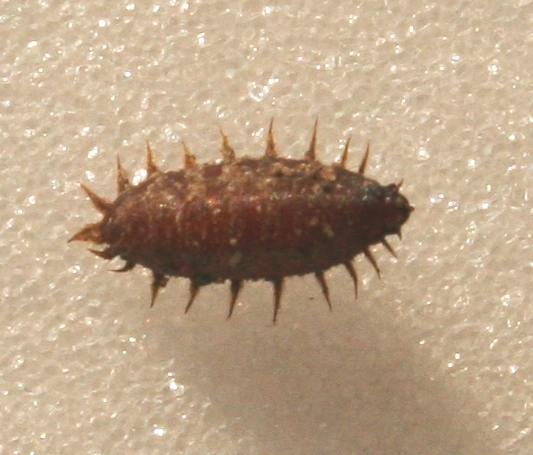Sono stato impressionato da questa strana crisalide, forze perchè ho iniziato a guardarla al contrario. Adesso a mente lucida mi sembra semplicemente una crisalide di lepidottero e le protuberanze assomigliano molto alle escrescenze di certi bruchi. Non ho capito bene nemmeno da dove arrivi, l'ho trovata sul fondo di un barattolino in cui avevo messo un femmina di Lucanus cervus trovata già secca e una foglia di Prunus serotina in cui avevo avvolto il coleottero per non romperlo. La crisalide deve essersi staccata da una di queste due, propendo per la foglia. 01-09-2010 Cavaria con Premezzo (VA) Lombardia. quota 300 m circa lunghezza 7mm |