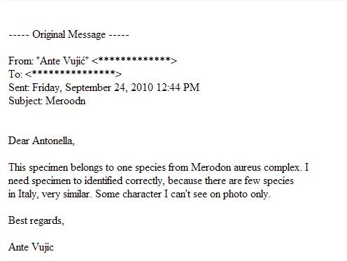 Il Merodon in questione appartiene al complesso Merodon aureus, il responso non è mio, ma è stato dato da uno dei massimi esperti del gruppo Merodon, prof. Ante Vujic, che ho interpellato via fax sottoponendogli questa discussione (spero non ti dispiaccia Mauro). Ho chiesto via mp a Marcello/Velvet Ant se è possibile allegare la risposta autentica del professore...speriamo di sì :) !