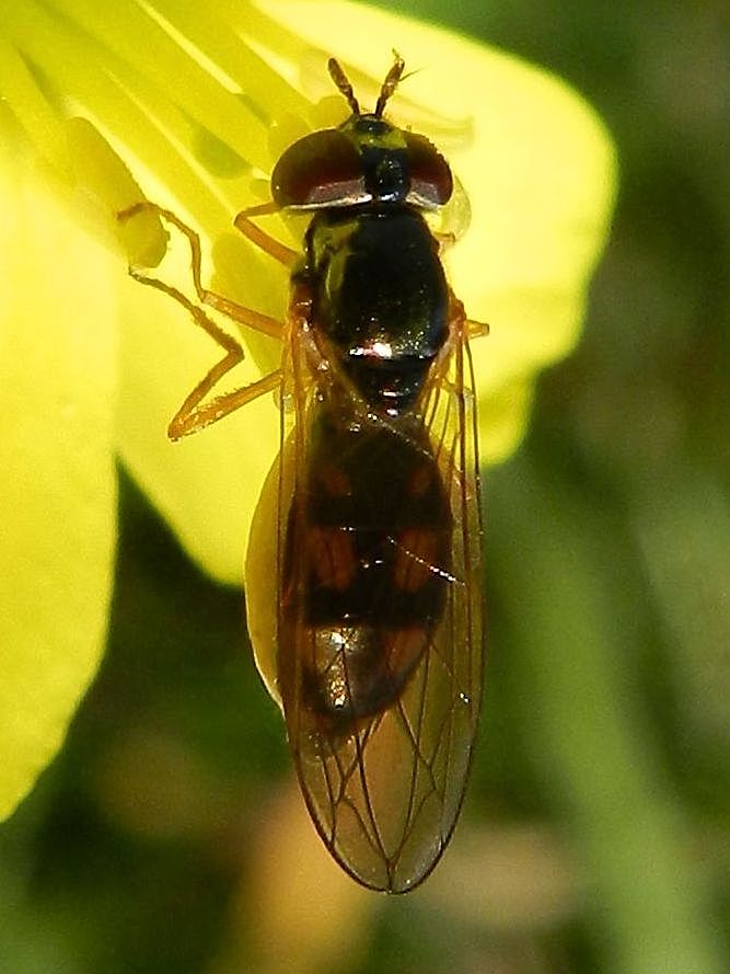 Non vedo la cellula discale tipica degli Stratiomyidae; mi sembra invece di intravvedere la vena spuria tipica dei Syrphidae. Con le ali così sovrapposte non è facile leggere la nervatura, quindi non scommetterei grosse somme sulla seconda affermazione, mentre sulla prima mi sento un po' più sicuro. |