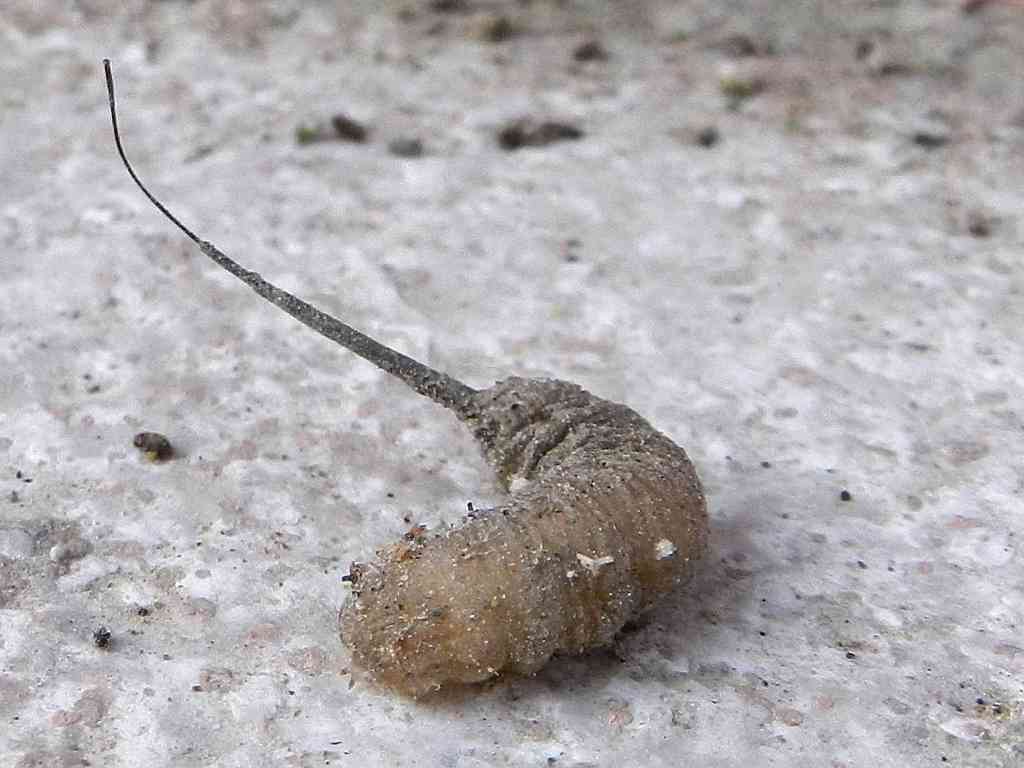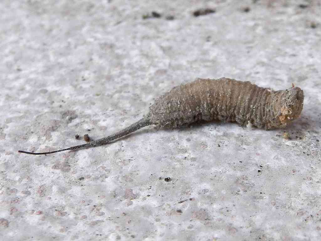 So che larve simili appartengono ai ditteri della fam. Syrphidae, in particolare quelli del genere Eristalis, ma questa mi è sembrata troppo grande; più di cm. 1 cm senza la coda. Inoltre mi ha sorpreso il luogo di rinvenimento, poiché le larve di Eristalis vivono nel letame e nei liquami, dove sopravvivono traendo l’ossigeno dalla lunga appendice di cui sono dotate.