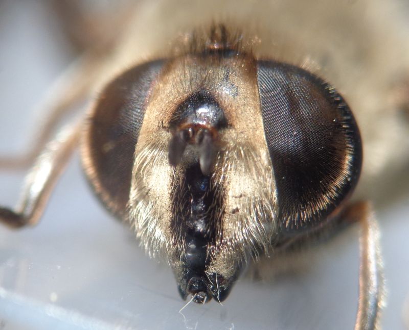 Le bande pelose sugli occhi sono diagnostiche, femmina di Eristalis tenax (Linnaeus, 1758).