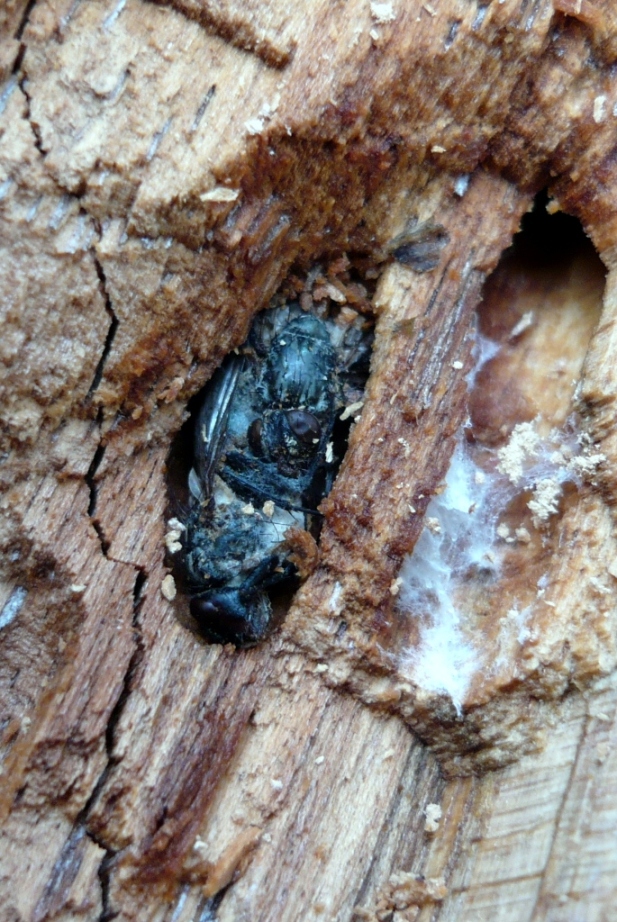 Anch'io oggi come Carlo son stato al passo dei sambuchi (ce ne sono diversi nella mia collina  ). Mentre facevo legna per il camino, un pino mi si è sfaldato in mano ed era pieno Sino dentron  il midollo di buchi e cellette, piene di fantastici mosconi parassiti