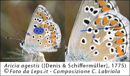 Sono rientrato da circa un paio di orette da una delle giornate più faticose di lavoro  . Non ho resistito e volevo vedere a che punto si era arrivati in questa discussione a cui ho partecipato in modo volante questa mattina. Incomincio con il darmi un paio di bastonate in testa clido ha scritto: ...e vedendo l'ultima foto, che certamente è del secondo esemplare, per me si tratta di Polyommatus (Polyommatus) thersites ... Avevo compreso l'esatto contrario e cioè che Silvio avesse inserito "certamente" una foto del secondo esemplare ritratto, mi sono quindi basato frettolosamente solo sul colore, che ripeto secondo me non è da escheri perchè quest'ultimo è più brillante e chiaro, avendo già espresso il mio giudizio sul rovescio dalla seconda foto e dunque avvalorava la mia ipotesi. Il primo esemplare, che è lo stesso della terza foto inserita da Silvio è per me un Plebejus, dunque non concordo con Maurizio. Gli spot neri nell'area submarginale delle posteriori sono esattamente da Plebejus sp. e per me si potrebbe trattare o di Plebejus (Plebejus) argyrognomon (Bergsträsser, 1779) o di Plebejus (Plebejus) idas (Linnaeus, 1761) visto il bordo nero marginale sulle anteriori molto sottile. Per il secondo esemplare continuo a sostenere la tesi che si tratti di Polyommatus (Polyommatus) thersites (Cantener, 1834), per i motivi che ho detto nel mio primo intervento, di seguito la foto di Silvio con il particolare della prima lunula sulle posteriori. In escheri l'arancione è decisamente ridotto, così come più in generale l'arancione, specie sulle anteriori. Potete vedere per confronto alcuni esemplari di thersites sul sito di Paolo e anche quiConcludo il mio ragionamento escludendo che il secondo esemplare possa essere una Aricia sp.. Di seguito ho preparato una illustrazione che mostra due modi di verificare il carattere che distingue le Aricia... Nell'illustrazione è ritratto lo stesso esemplare, la foto come specificato l'ho presa in prestito da Leps.it. Nella prima a sinistra ho evidenziato con un ellisse le due macchiette che in Aricia sono sempre ravvicinate ed isolate dalla macchietta indicata dalla freccia. Potete vedere che nell'esemplare fotografato da Silvio non è così. Il secondo metodo che si può utilizzare è quello di tracciare una retta tra la seconda macchietta (partendo dall'attaccatura dell'ala posteriore ) e la quarta. In Aricia la macchietta n. 3 (quella indicata dalla freccia nella foto di destra) resta sempre al di sotto di questa linea immaginaria. Anche questa seconda possibilità non si verifica nell'esemplare ritratto da Silvio. Spero di non aver scritto troppe corbellerie vista l'ora e la stanchezza, in tal caso vogliate perdonarmi