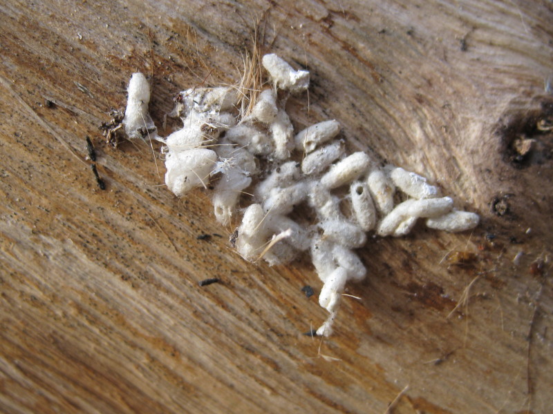Bozzoli di imenotteri parassitoidi usciti da qualche povera larva dopo averla esaurita. Probabilmente guardando bene si poteva trovare ancora qualche traccia del corpo dell'ospite.