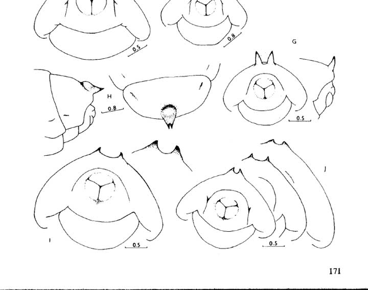 Setae relatively dense, anterior praesternal lobe bearing at most very few scattered minutę setae, in young larvae glabrous. Microscopic spines distinct, pronotum with smooth spots distinct, less numerous than in A. rusticus (cf. Fig. 30D). Mediopraester-num without medial smooth area. Marginal chambers few, very smali, up to about 10 chambers present. Urogomphi rather peculiar (Fig. 32H). Largest available larva 30 mm.Plate 32: A — Asemum striatum, later instar, microspiculate area of pronotum. B — Arhopalus rusticus, maturę, second dorsal ambulatory ampulla. C to J — end of abdomen with urogomphi: C Megasemum ąuadricostulatum, posteroventral view. D — Spondylis buprestoides, dtto. E — Asemum punctulatum, dtto. F — As. striatum, dtto. G — As. tenuicorne, posteroventral (left) and lateral (right) views. H — Arhopalus syriacus. lateral (left) and dorsal (right) views. I — Arh. tristis, posteroventral view. J — Arh. rusticus, dtto. (The figurę, although drawn from