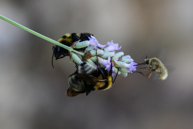 Allego anche questa foto di grappolo di bombi su lavanda e piccolo imenottero che vedo spesso ma non saprei ben identificarlo (è sulla destra immagine).