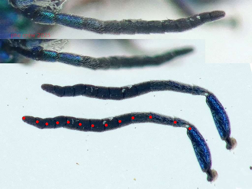 ...anche nelle antenne manca la lucentezza metallica guardandole dal lato interno, ma solo nell' articolo II e III nel primo no (parte sotto della foto). Invece guardando le antenne da sopra (parte superiore della foto) gli articoli II e III sono chiaramente metallici e ovviamente anche il primo.