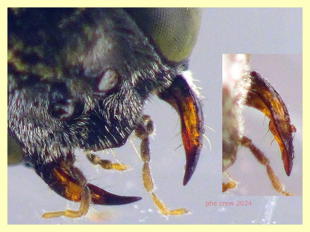 ...clipeo e mandibola sinistra, edeago e notch femore anteriore....quella scanalatura che corre lungo tutto il femore e' presente anche nell' altro soggetto maschio...cioe' questo