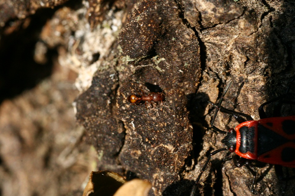 Muovo finalmente i primi passi con la macrofotografia (che adoro già :lov3: ) così posso finalmente accedere a quelle specie altrimenti "invisibili" al mio precedente obiettivo. Chiederei il vostro aiuto con questa formica: si spostavano tra gli anfratti della corteccia alla base di un grosso sempreverde, in zone illuminate dal sole. Occhio con le dimensioni non ne ho, dunque aggiungo anche una foto più sfocata dove però è presente anche un Pyrrhocoris apterus in modo da avere un termine di paragone.