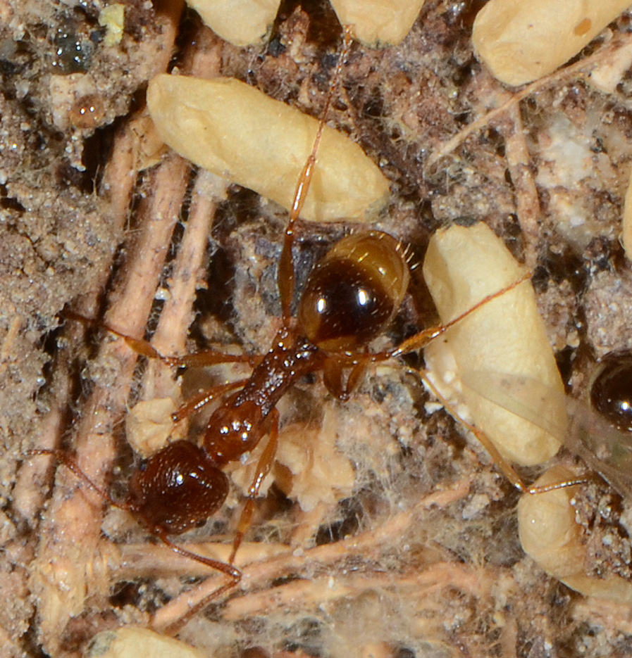 Tutte quelle pupe che si vedono invece non sono di Aphaenogaster, dato che le pupe delle Myrmicinae non producono sacchi pupali di seta come quelli. Potrebbero possibilmente essere pupe della Ponerina, ma non mi convince il rapporto di dimensioni tra operaia e pupe, per cui potrebbe anche esserci una terza specie di mezzo. C'è anche qualche pupa di Aphaenogaster in fase di pigmentazione qua e là.