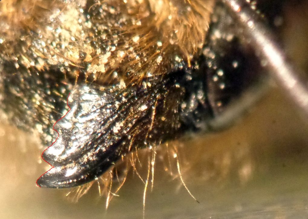 In una delle foto mi sembra di vedere il margine interno della mandibola dritto fin quasi all'apice, se è così confrontala con M. ericetorum che la mandibola come quella dei Calichodoma. Se invece la mandibola è normalmente dentata, la scopa potrebbe essere compatibile con M. alpicola: rossa tranne negli ultimi due segmento dove è nera. |