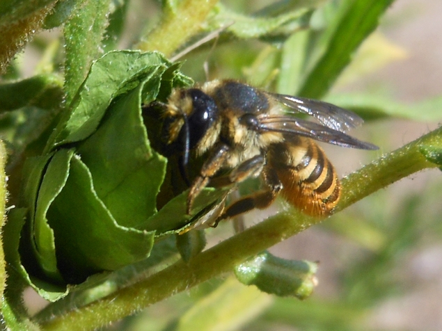 Ieri pomeriggio ho assistito ad una curiosa scena, in una campagna gallurese, su una pianta di Dittrichia viscosa. Ho notato l'andirivieni di un imenottero tra le foglie , e vi ho scoperto un nido, dove la solerte apina continuava ad aggiungere polline. Ho lasciato la mia scomoda postazione per un quarto d'ora circa, e quando son tornata a controllare, il nido era già sigillato. :)
