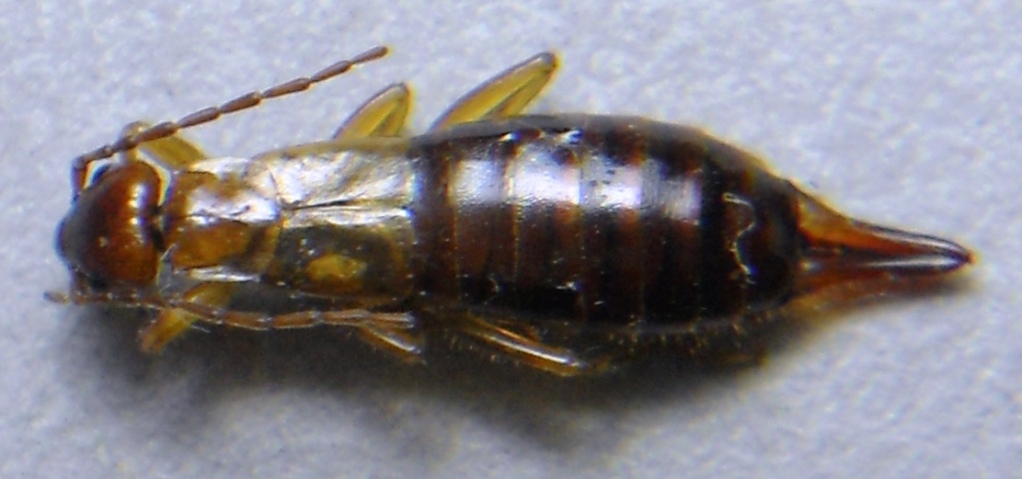 Nemme4no a me sembra forficula auricolaria (numero articoli antenne, ali sporgenti dalle tegmine con caratteristiche macchie chiare, dimensioni). Questa forbicina ha antenne con soli 9 articoli, dimensioni più ridotte e ali che non sporgono dalle tegmine.